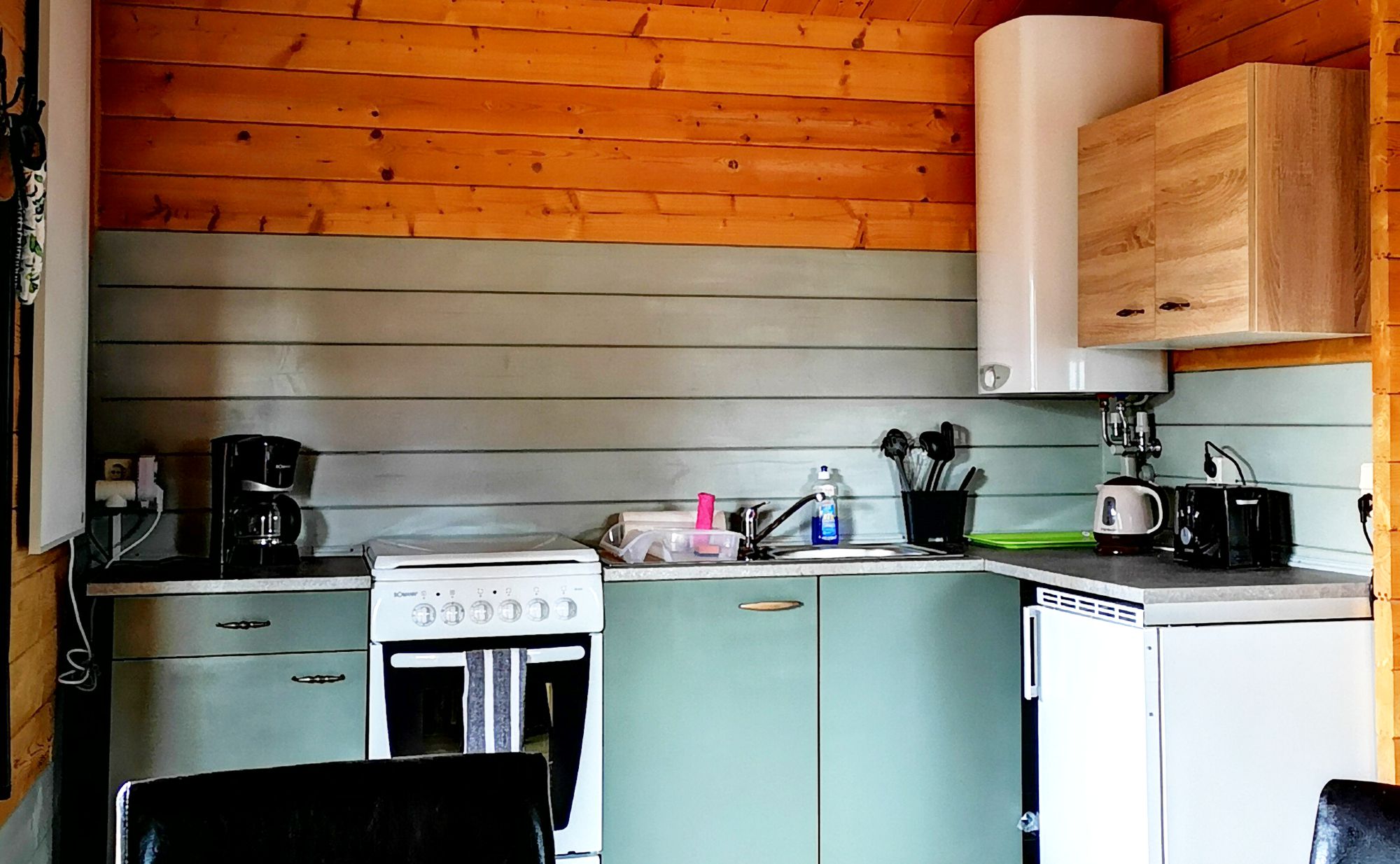 Küchenzeile: 4-Platten-Herd, Kühlschrank mit kleinem Gefrierfach, Filter-Kaffeemaschine, Wasserkocher, Toaster, Geschirr und Besteck, Töpfe, Pfannen, Spülmittel, Lappen, Geschirrtuch